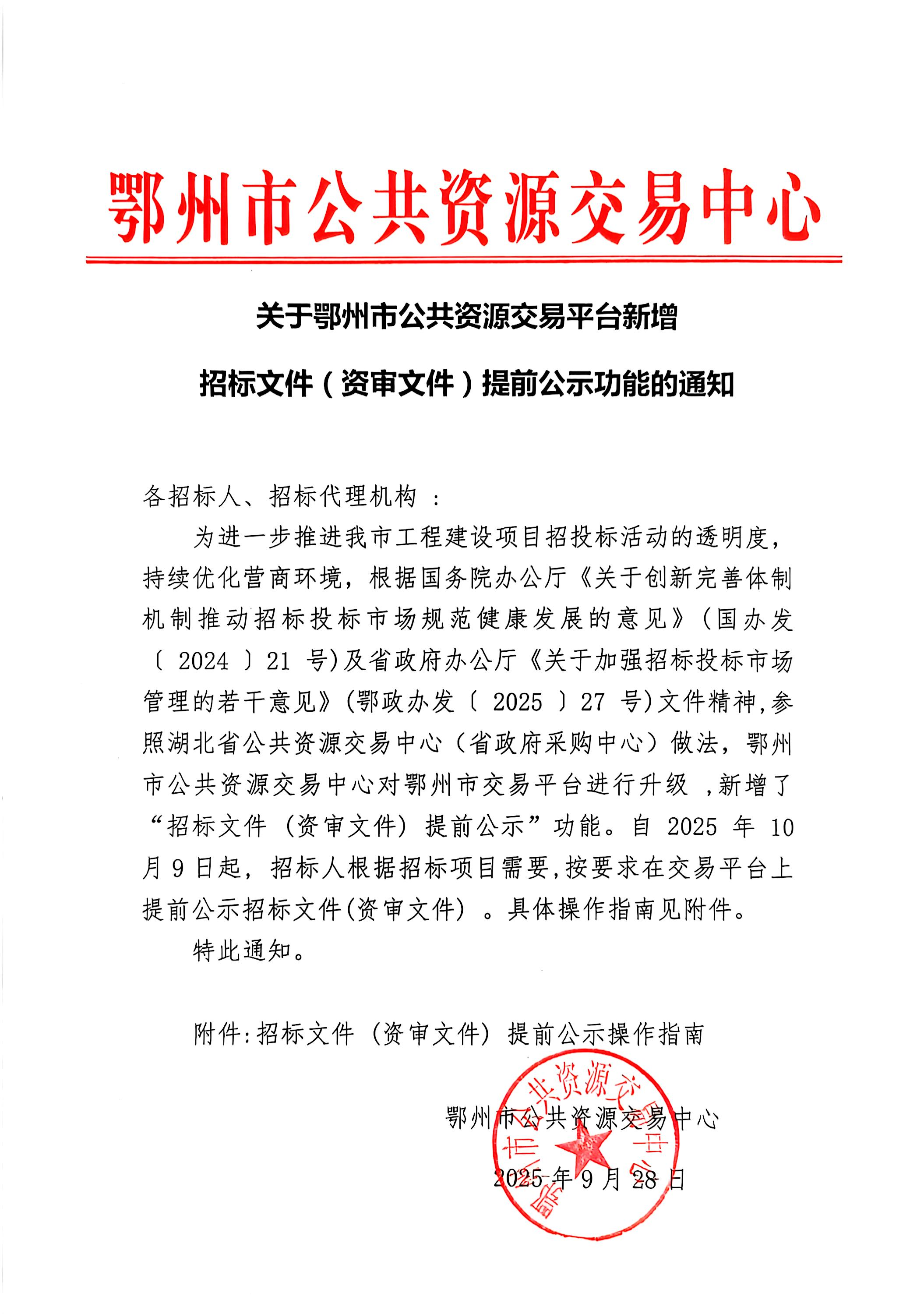 关于鄂州市公共资源交易平台新增招标文件(资审文件)提前公示功能的通知