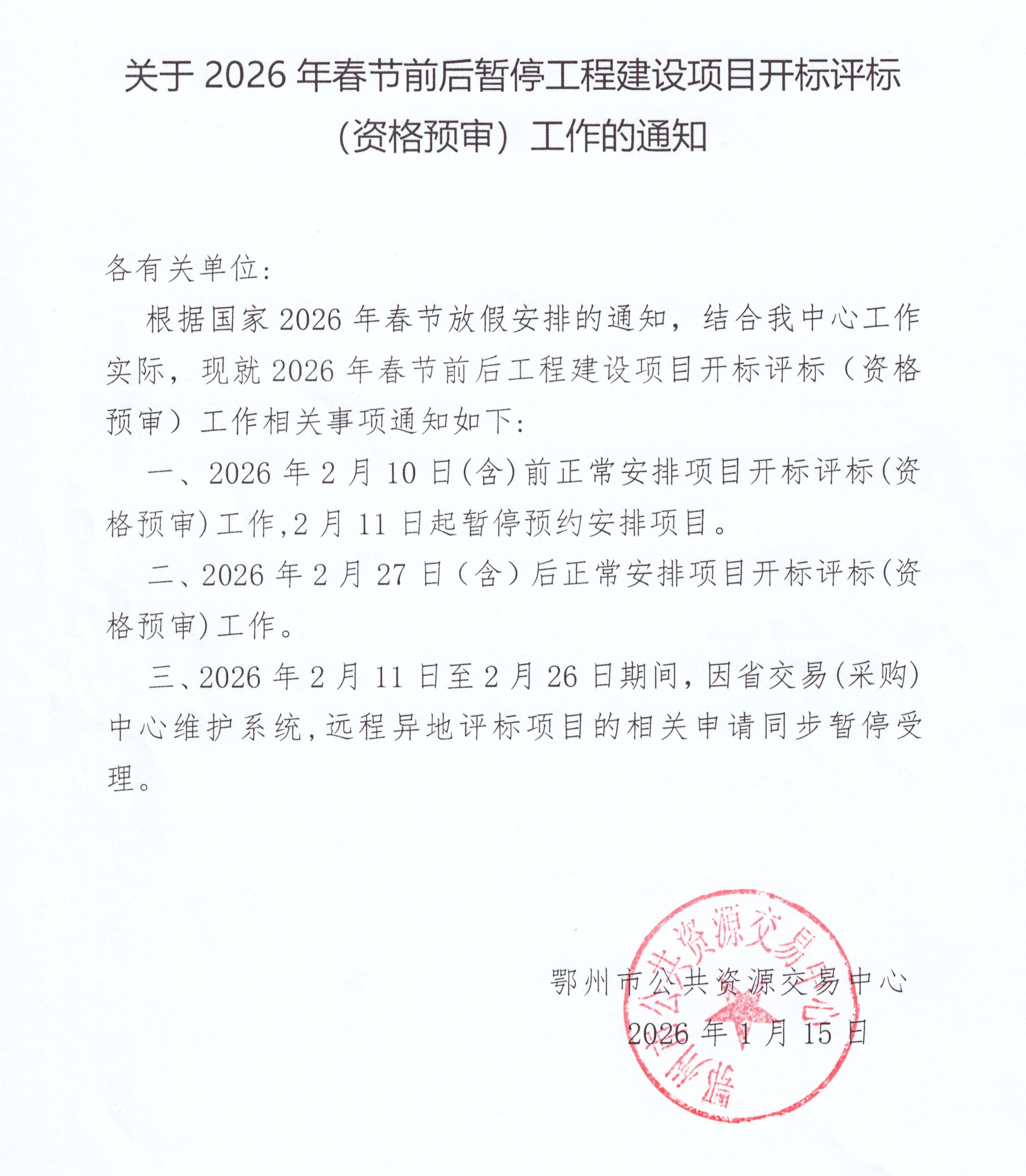 关于2026年春节前后暂停工程建设项目开标评标(资格预审)工作的通知